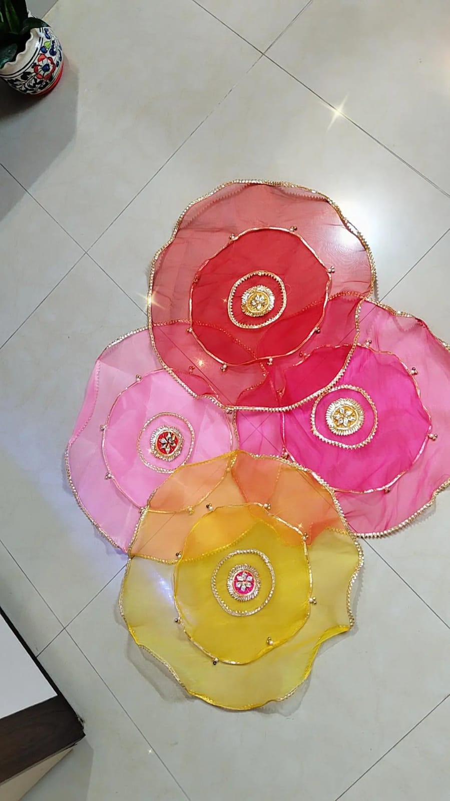 Enhance the beauty of your festive rituals with our Gota Design Tissu Thali Covers, thoughtfully crafted for special occasions. Made from premium tissu fabric, these thali covers are adorned with intricate gota work, adding a traditional and elegant charm to your celebrations. This set of 3 covers is perfect for adorning thalis during weddings, poojas, and other festive ceremonies.