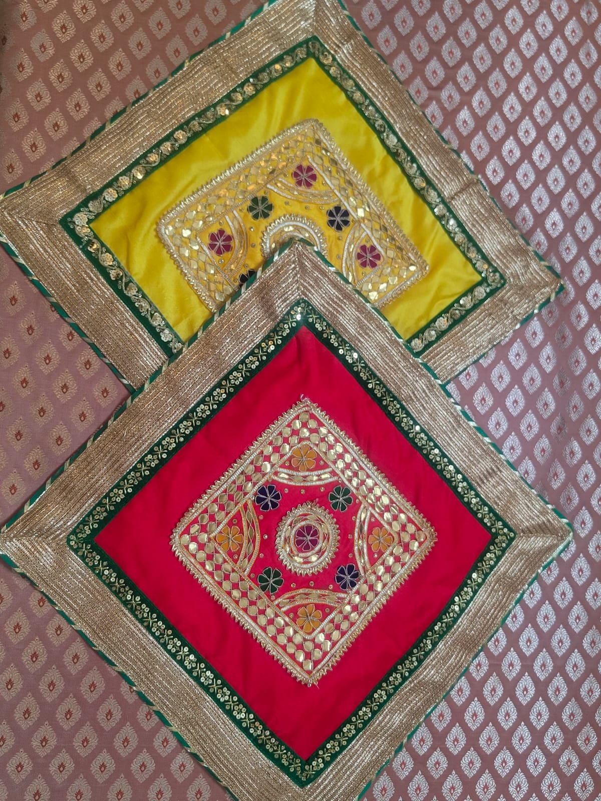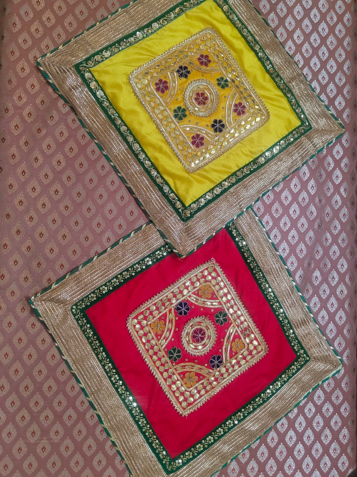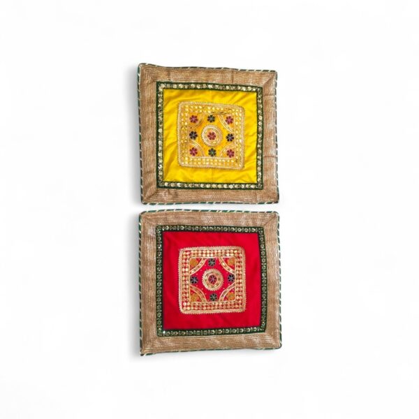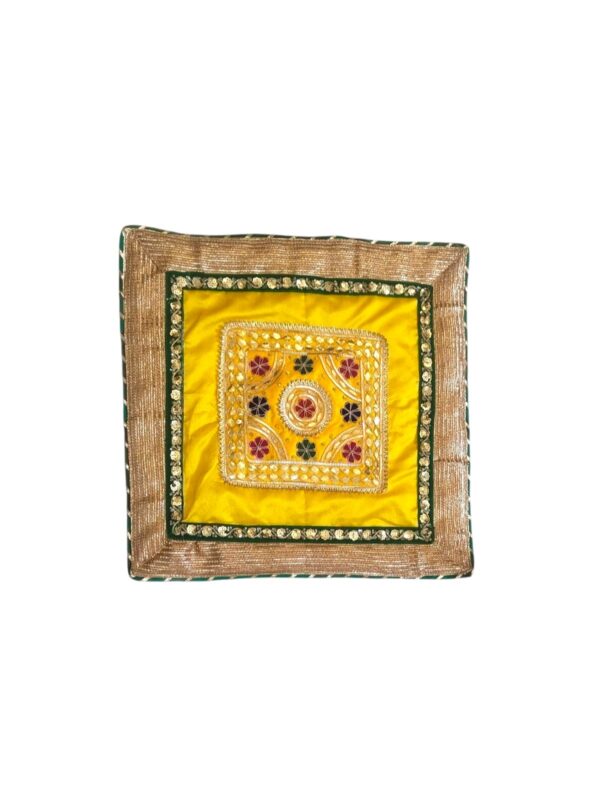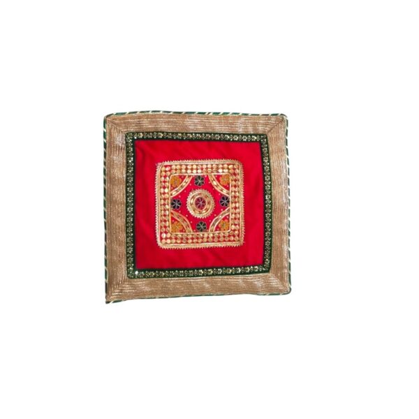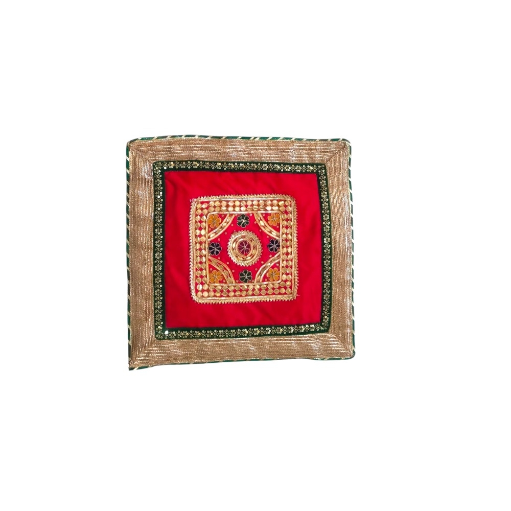 Enhance the sacred charm of your rituals with this beautifully crafted Gota Patti Dupion Silk Aasan, designed to bring elegance and tradition together. Made from rich dupion silk and adorned with intricate gota patti work, this aasan adds a royal touch to every auspicious occasion.