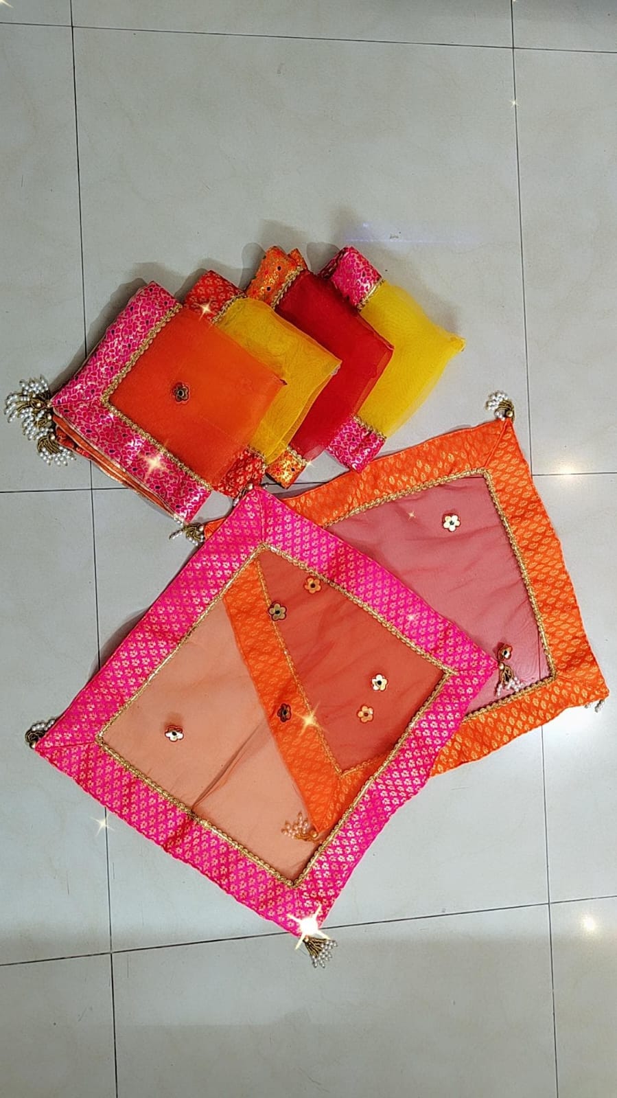 Lightweight yet durable, these thali covers are easy to handle, store, and reuse. The intricate gota detailing and elegant frills create a festive look that makes every celebration more memorable. This set of 3 Gota Tissu Double Frill Thali Covers transforms your rituals and presentations into a graceful and stylish experience.