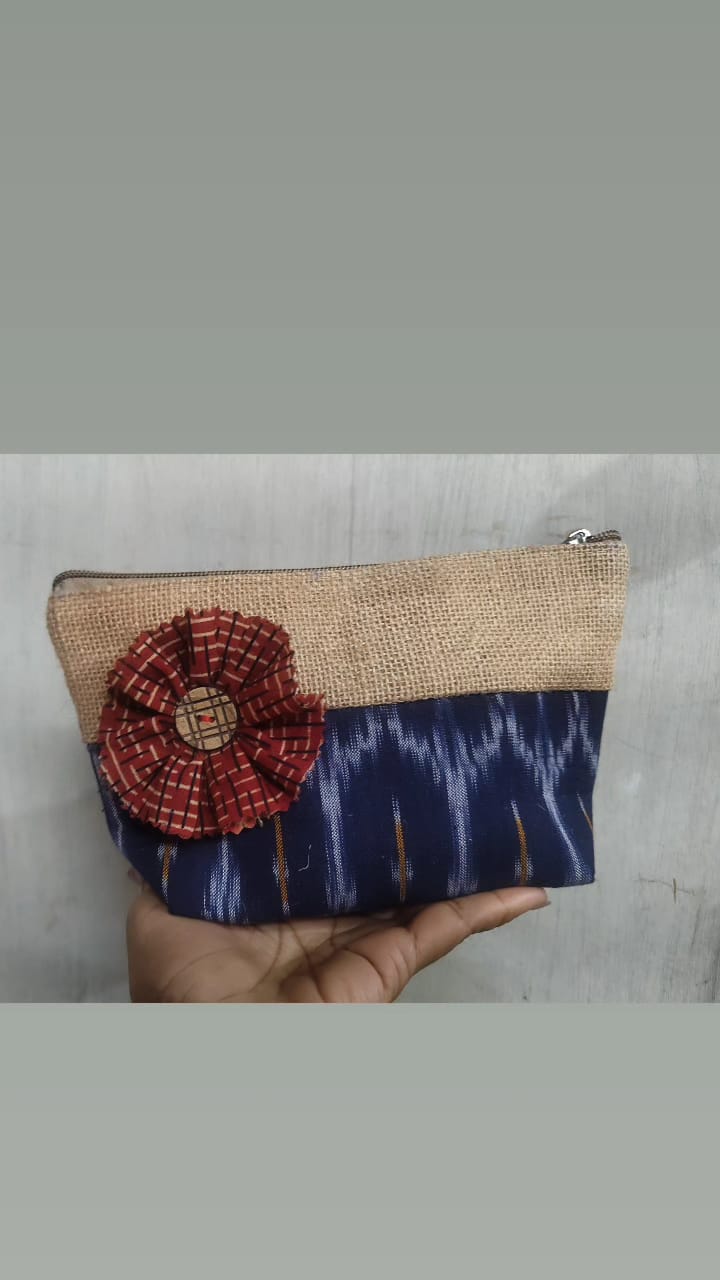 Lightweight yet sturdy, this pouch is ideal for daily use, gifting, or travel, offering both practicality and aesthetic charm. The handcrafted gota flower detailing adds a touch of traditional elegance, making it a versatile and stylish accessory. This single-piece Jute & Cotton Zip Pouch is a perfect blend of beauty, utility, and craftsmanship.