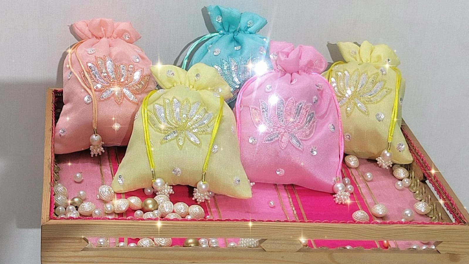 Ideal for weddings, engagements, baby showers, festive celebrations, and special events, these potlis combine elegance with functionality. The delicate sequin work adds a festive shimmer, while the sturdy yet lightweight design ensures your gifts are beautifully showcased. This set of 3 Lotus Sequin Potlis makes gifting memorable, elegant, and effortlessly charming.