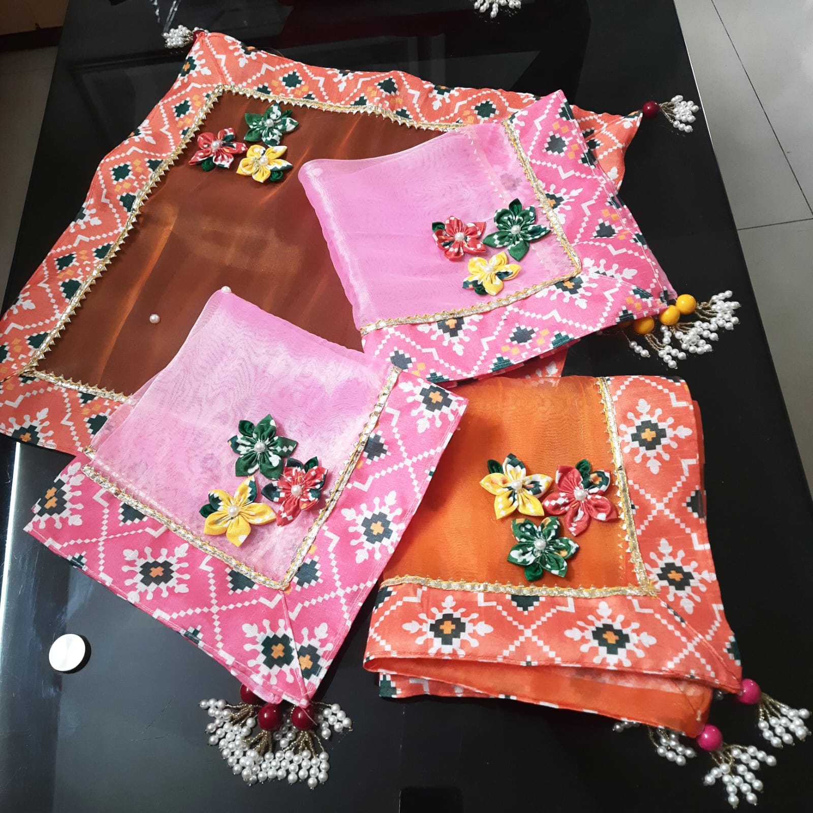Elevate your festive rituals with our Patola Design Thali Covers, beautifully crafted from a blend of organza and dupion silk. Each cover measures 18 x 18 inches, making it perfect for adorning thalis during weddings, poojas, and other special ceremonies. The intricate Patola-inspired design adds a touch of traditional elegance and sophistication to every celebration.